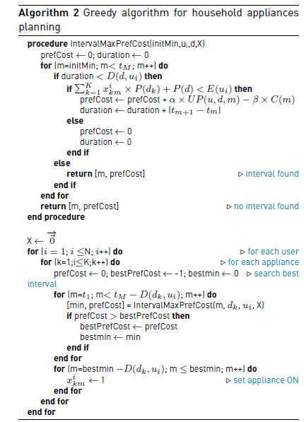 Two baseline heuristics strategies were implemented for evaluating the results of the proposed EA for household appliances planning: a greedy algorithm and a Business-as-Usual (BaU) planning strategy, which are described next. Greedy planning strategy. Greedy algorithms iteratively build solutions based on a taking optimal local decisions in each step. For this particular case, a greedy algorithm from the literatura[16] was adapted.
