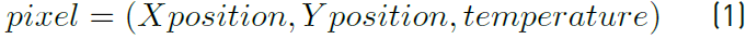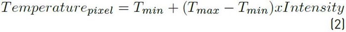 In order to obtain the estimated pixel temperature, the image is initially converted to grayscale, and then the intensity values are normalized to find the new pixel value using Equation (2):