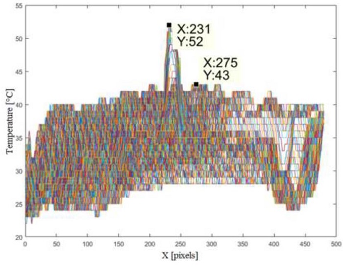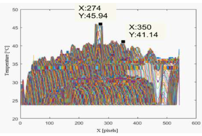 The intensity graph in Figure 4 might be confused with a grayscale image, however a grayscale algorithm was not used, instead, it is the direct graph of the pixel intensity information obtained from the metadata of the image captured by the thermal camera. This presents an important advantage because the exact temperature of each element in the image can be obtained without the need for any type of image processing.