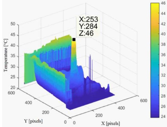 Figure 6 shows the representation of the temperature of the panel with a hot spot in a three-dimensional mesh. The arrangement of the thermal intensities can be observed, allowing to easily identify the hottest point of the image.