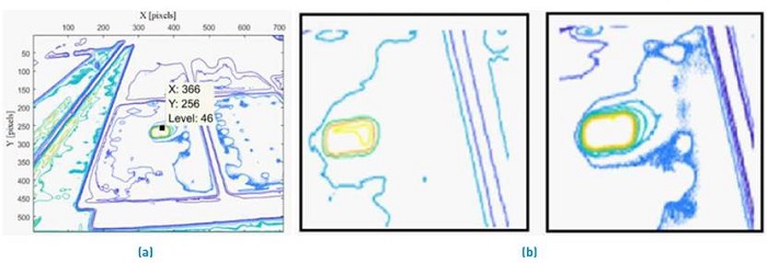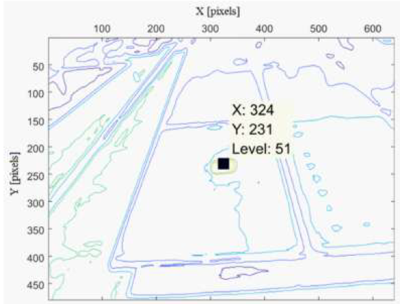 Also, on Figure 7, a contour analysis of the temperature data is observed. Contour shows the projection of Figure 6 Z-axis (temperatures) on a two-dimensional image. This analysis can be used as an edge detection approach to identify faulty cells.