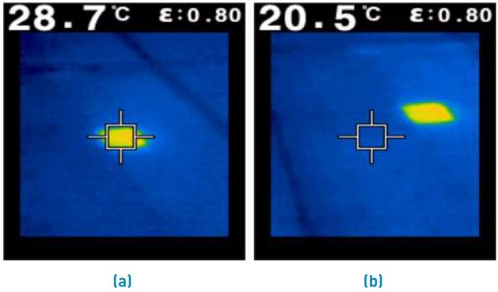Thermal cameras or specifically Infrared Thermometers with thermal cameras like de Flir TG167 do not provide a color map nor temperature tables as the other low-cost IR thermal cameras discussed in this paper. Nevertheless, they can provide useful information and be able to detect hot spots in PV panels. Figure 13 shows thermal images obtained with this camera. It is observed that the cell with anomalies is clearly differentiated from an unaffected area. The image shown corresponds to a different measurement, and as this type of thermal camera does not provide more data from the temperature pattern, it is not considered in the error calculation.