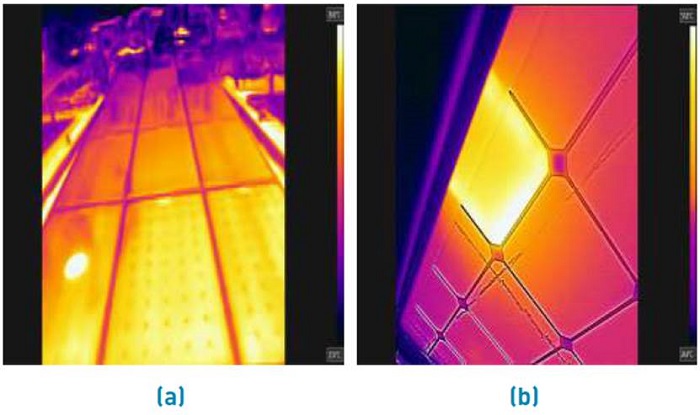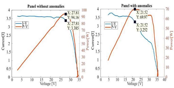 To validate that the cameras used in this study are capable of identifying a fault in a PV panel , I-V/P-V curves of the PV panel with a faulty cell where obtained using a Solmetric PVA-600 tracer[12]. Panels with hot spots or faulty cells reduce their power output and I-V/P-V curves differs from unaffected panels. PV panel found with a hot spot is an ATERSA A-250P monocrystalline panel[13]. Figure 14 shows I-V and P-V curves of the panel that has a hot spot and a panel without faults as a comparison. It is observed that the voltage of the panel with failure falls at around 16Vdc, showing a typical behavior of a damaged or “shaded” cell[14-17] which matches the thermography image. Reviewing the P-V curve of the panels, the decrease in the maximum power point (MPP) is observed, power decreases from 94.16W on the panel without anomalies (see Figure 14a), to 69.97W on the panel with anomalies (with a hotspot, see Figure 14b) obtaining a 25.69% less power in the panel with the hot spot compared to a panel without failures.