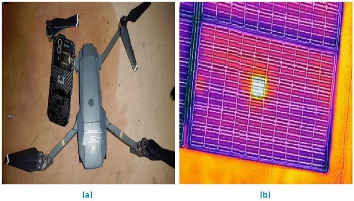 Inspections with low-cost cameras can be carried out with the help of remote-operated mobile systems. Further information about this kind of onboard thermal inspections can be found in[18, 19]. In this research, the behavior of the Cat S60 camera is tested. The camera was mounted on a DJI Mavic Pro drone [Figure 16a) and used as proof of concept in order to verify that this camera can show the hot spot on the faulty panel. Figure 16b was obtained by flying the drone at three meters above the panel. It is noted that the hot spot in the image can be clearly identified. However, this camera does not deliver a heat map or a temperature table in video capture mode, so its use should be limited to manual hot spots detection.