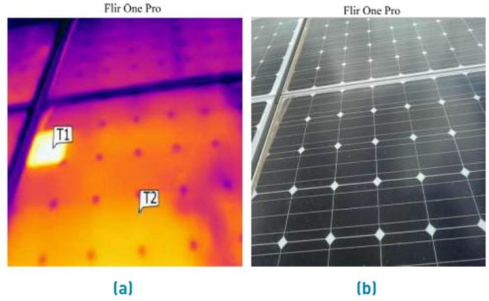 Low-cost IR thermal cameras in Table 2 were used to perform a thermographic analysis of the PV solar farm described in[10]. As a summary, University of Cuenca’s solar farm has 35kWp installed, with 80 polycrystalline and 80 monocrystalline PV panels, and has been under production since 2016. After manual inspection of the 160 solar panels, two were found with hot spots. One of these anomalies captured with a Flir One Pro camera and processed with the Flir Tools software[11] is shown in Figure 2. The image corresponds to the first panel with a hot spot. Two points identified as T1 and T2 are observed (see Figure 2a), with temperatures of 38.2.0°C corresponding to a hot spot and 32.0°C corresponding to a healthy area of the panel. Figure 2b shows the visible light image taken with the same camera.