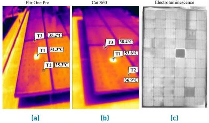 The thermal cameras used in this document cost less than 10% of high-end cameras, without compromising the detection of hot spots in PV panels, which allows these low-cost cameras to be used in thermographic studies considering the limitations in terms of their construction and their feasibility of outdoor use.