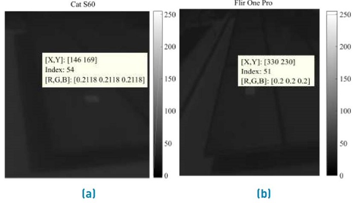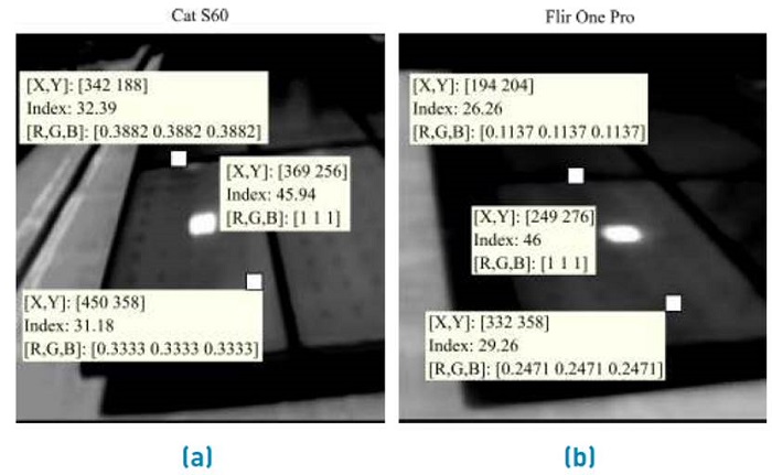 In Figure 1, images captured with low-cost IR thermal cameras under study are observed. All cameras offer similar behaviors, but the higher resolution Flir One Pro camera presents a sharper and more edge defined image than the lower resolution Cat S60 camera. On the other hand, the FLIR TG167 image has a very low image resolution, but this often can be seen as an advantage as embedded image processing is concerned (lower resolution means fewer processing power needed).