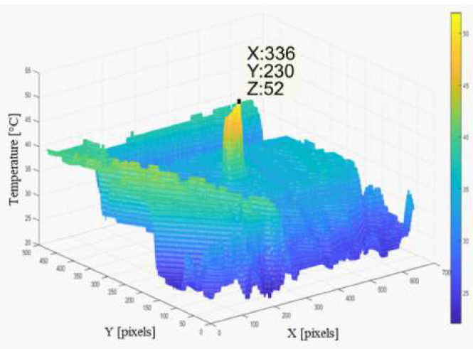 Repeating the procedure for the three-dimensional mesh in the static image Figure 11 is obtained. A similar behavior was found for the thermal image obtained with a Cat S60 camera, with the difference in the maximum temperature achieved, and in the same way as in the XY scatter plot (dispertion), a greater amount of values are observed in the base of the graph within the lower range of temperatures of the image.