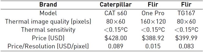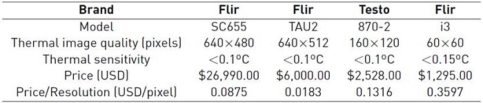 Options presented in Table 1 are considered high-resolution or professional thermal cameras. Sensor’s resolution used on these models allows detailed analysis of thermal patterns. Regarding cost and resolution relationship, most expensive options have a smaller cost per resolution ratio. Among them, the Flir TAU2 camera stands out with a lower cost per pixel.