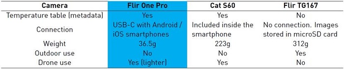 Table 3 shows a comparison of the cameras used and the limitations found according to on-site tests.