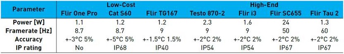 Table 4 shows a technical comparison or four high-end thermal cameras, and the three low-cost alternatives discussed in this document based on power, framerate, precision and IP rating. It is observed that low-cost cameras tend to have a lower power consumption, framerates and accuracy. This could be a problem regarding the application characteristics, for example, if a thermal analysis needs a real-time temperature monitoring system with instant readings, high-framerate cameras are the best choice.