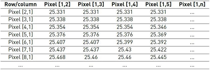 Table 5 shows metadata obtained from images taken with the Flir One Pro. This metadata corresponds to the temperature of each pixel in the image. This data allows temperature analysis of each point of the image. Similar data is obtained with the Cat S60 camera. For the Cat S60 camera a 240x320 matrix was found, while the Flir One Pro delivered a 480x640 matrix.