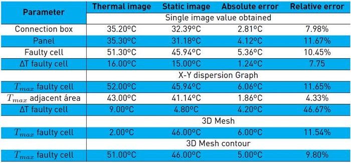 Table 6 shows the temperature average values of the PV panel with a hotspot, obtained with the three low-cost cameras, and the relative errors between cameras. The temperatures obtained from the thermal image and the static image are shown, as well as the absolute measurement error based on the measurement with the sensor matrix, and the relative error between cameras. It is observed that in the image analysis a relative error of 10.45% is obtained for the measured temperature of the faulty cell, and a relative error of 7.75% for ΔT between the cell and an unaffected area. For the analysis of the X-Y dispersion, an error of 46.67% is observed for the faulty cell, while for the mesh analysis there is an 11.54% error and for the three-dimensional contour a 9.80% error. This indicates that contour analysis and mesh analysis are better candidates than dispersion analysis in image processing in cases where the temperature table is not available.