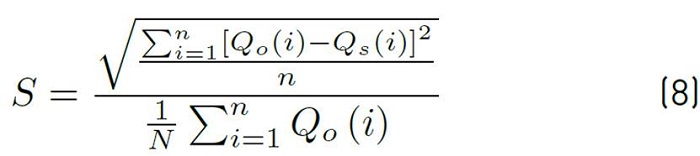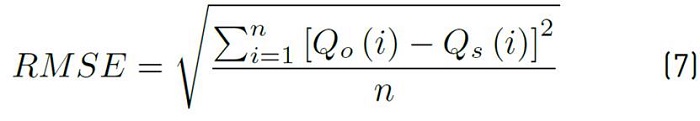 Where Equation (6), xo is the observed value of a typical hydrograph and xs is the simulated value of it Where Equations (7)-(8).: Qs (i) y Qo (i) are the flow simulated and observed in the respectively discharge, and, n is the number of observations in the time series.