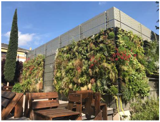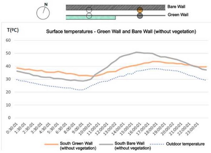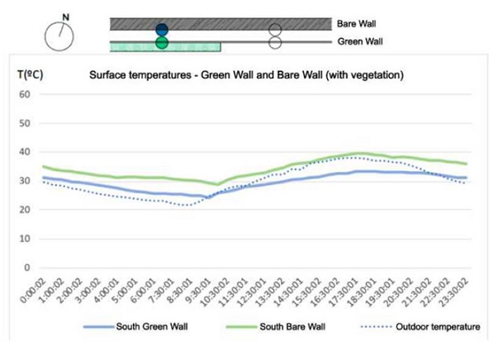In general, data analysis allows us to demonstrate that a vertical garden, on a sunny summer day, is capable of absorbing part of the incident solar radiation, achieving a much cooler temperature at the back. On 19 July, at the point of maximum irradiance, an outdoor temperature of 37.7ºC was recorded, while in the vertical garden it was 38.7ºC, and in the wall area at the back of the garden, it was 32ºC. This allows us to affirm that the temperature of the environment 1.5 meters away from a vertical garden can reduce up to 5ºC the temperature concerning the temperature of the air, which leads us to conclude that this type of solutions allow us to improve the hygrothermal conditions of the surrounding environment, and affect the energy consumption of the buildings linked to the air conditioning of the spaces.