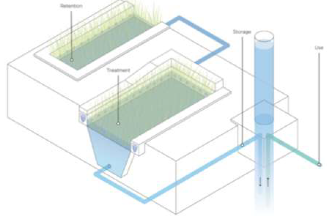 To quantify the effect of a circular system for integrated water management in built environments on the temporary retention of runoff water and the elimination of pollutants.