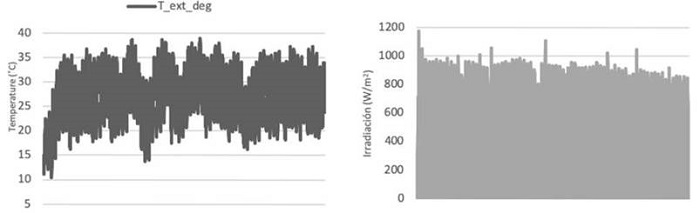 July 19 has been a sunny summer day, in which the average temperature is 29ºC, with a maximum temperature of 38.1ºC at 17:30h and a minimum temperature of 21.7ºC at 8:30h. As can be seen in the graph [Figure 7] the solar radiation incident on the building begins at 7:30 am, reaching its maximum at 14:00, where a value of 902 W/m2 is recorded. From that point on, the radiation begins to decrease, until it becomes null at 21.00h.