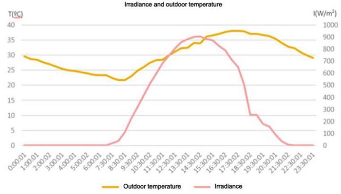 Figure 9 expresses the comparison between the temperatures recorded on the wall and the metal enclosure. At night, with the decrease in outside temperatures, the temperature of the enclosure also decreases considerably. In the same way, as the temperature increases during the day, so does the surface temperature of the enclosure, reaching 50ºC in the hours of maximum irradiance. In contrast, the wall maintains its temperature constantly, registering maximum differences of 10ºC throughout the day, as opposed to more than 20 degrees of difference in the metallic mesh.