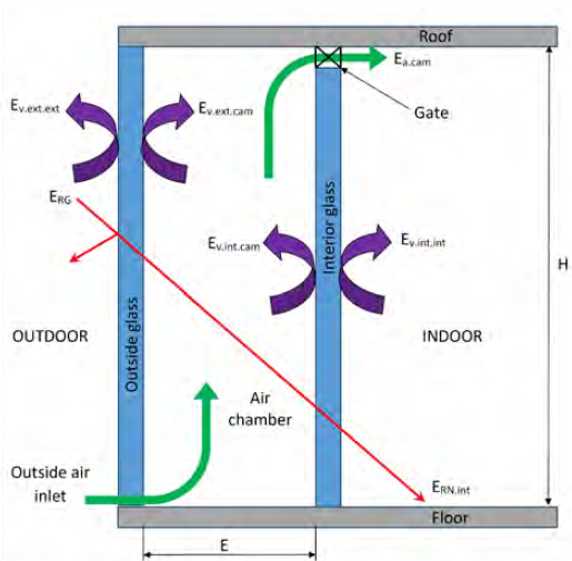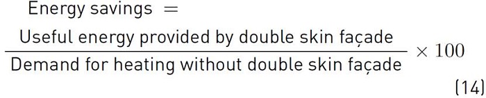 The procedure summarized below is based on the determination of the energy flows in the double- skin façade to quantify what part of the incident solar energy can be used for heating the building. By taking advantage of this energy flow, the heating system will have a lower producing consumption, therefore an energy saving. A predictable increase has not been determined in energy consumption for cooling that the same double-skin façade would produce in the summer season, since there are multiple solutions with different efficiencies to produce shade on the façade, and thus, reduce these hot gains.