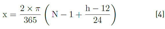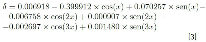 δ = solar decline (rad). It can be determined for each hour of the year with Equation (3)