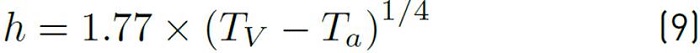 h = Coefficient of convection (W/m2 oC). In this case, as it is a flat surface placed in a vertical position or close to it, this coefficient can be obtained with Equation (9).