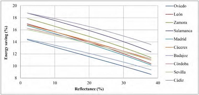 This variable also greatly influences the energy saving of double-skin façades, since the greater the amount of solar radiation reflected, the less solar energy is available to be introduced into the building. As can be seen in Figure 10, energy savings decrease with increasing reflectance. The decrease is linear, and the slope of the straight line is practically the same in all cities, so we can deduce that it is independent of the weather.