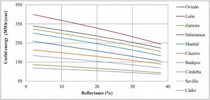 In Figure 11, the evolution of useful anaerobic energy as a function of the reflectance of the glasses is shown. It is appreciated that the useful energy varies according to a straight line, which presents a lower slope, the higher the annual average temperature of the city considered.