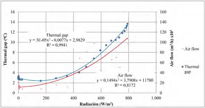 The first tests of the measurement system already show interesting data. As an example, the following figures show measurements of the day 09/14/2018. Figure 12 shows the evolution of air temperatures inside the camera and the solar radiation. In Figure 13, the thermal jump (air outlet temperature of the chamber minus inlet temperature) is shown as a function of solar radiation and airflow as a function of solar radiation. In both cases, the belt is very high, so it is considered that the measurement system installed is adequate. These equations will allow to determine the power generated in the form of hot air in the chamber (function of the flow and the thermal jump) in function of the incident solar radiation.