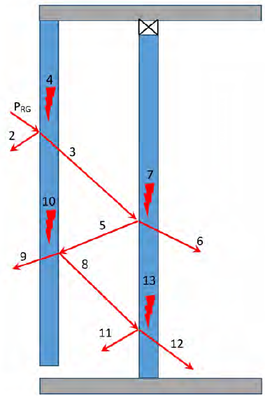 Known as absorptivity, transmissivity, and reflectance of the two glass panels, each of the energy flows listed in Figure 2 can be determined. By grouping the energy flows and multiplying the glass surface, the solar net that reaches the interior, the solar irradiance absorbed by each of the glasses, and the irradiance reflected to the outside can be obtained.