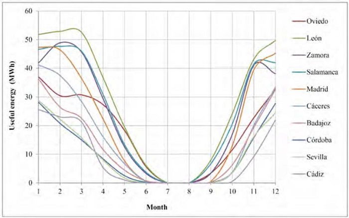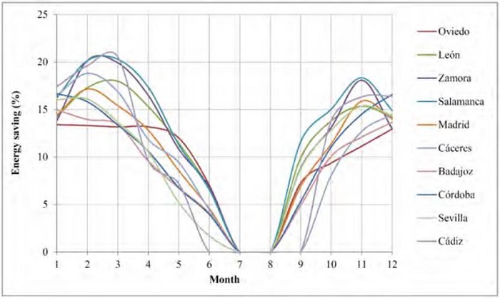 As explained above, the influence of location and climate on energy saving has been assessed through geographic and climatic data from 10 cities in Spain. Figure 3 shows the evolution of the useful energy produced by the double-skin façade, and Figure 4, the evolution of energy saving.