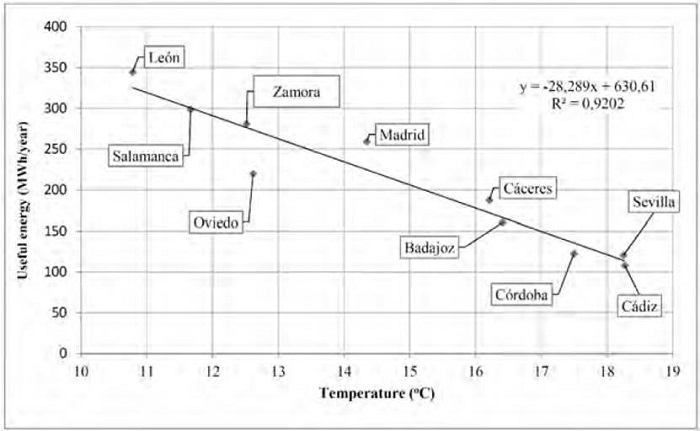 In absolute terms, the annual useful energy provided by the double skin façade is higher in cities with a lower average annual outdoor temperature. For the ten cities studied, a very high correlation has been found between the average annual temperature and the energy savings provided.