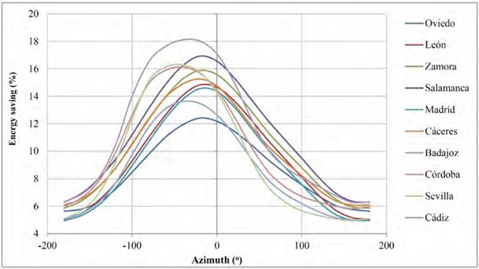 With the analysis of these data, it is deduced that there is a very high relation between the energy saving and the azimuth of the façade. On the other hand, contrary to what one might think at first sight, the pure southern orientation is not the one that produces the greatest energy savings in general. As can be seen in Figure 6, the maximum saving values depend on the city (climatology) and are deviated a few degrees towards the east with respect to the pure south orientation. The azimuth with which the maximum saving is obtained deviates more to the east, the higher the annual average temperature. This is due to the fact that the solar contribution is more usable for heating in the morning than in the afternoon, because the building has a greater demand for heating in the morning than in the afternoon, due to the thermal jump between the inside and outside in the mornings.