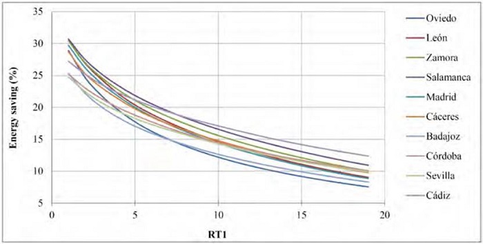 As shown in Figure 8, to obtain savings of percentages higher than 20% in any of the cities studied, RT1 must be less than seven. With RT1 values higher than 14, the energy saving is, in all cities, less than 15%, so the contribution of the double-skin façade may start to be of little relevance from an economic point of view.