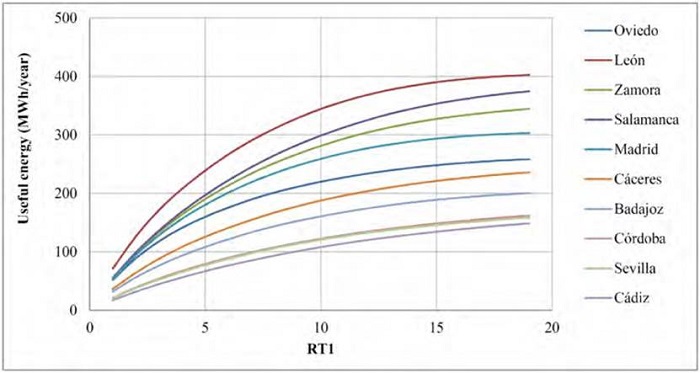 In Figure 9, it can be seen that in cities with colder climates, the useful energy increases rapidly with increasing RT1 until it reaches a value equal to 4. From this point, the useful energy continues to increase but with a lower slope. In cities with warmer climates, the curve of increase in useful energy has a more flattened shape.