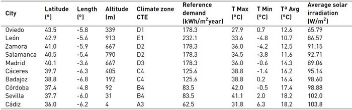 In order to evaluate the influence of climatology on energy saving, we have selected ten cities in Spain with decreasing latitudes. In addition, these cities are representative of different climates that occur in the country. Table 1 shows the chosen cities and their latitude, longitude, and altitude. In the same table, the climatic zone corresponding to each city is included, in accordance with the Code building technician (CTE)[13], and the referred heating demand considered for each city as established in Annex III.2 from the recognized document for the energy certification of buildings "Qualification of the energy efficiency of the buildings "[14]. The rest of the starting data are shown in Table 2.