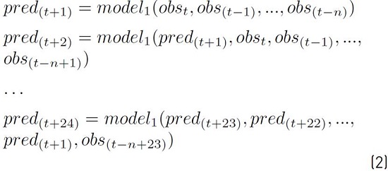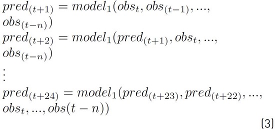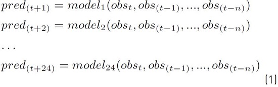 Direct strategies develop a different model for each time step to be predicted. Assuming past observations of the variable to be predicted are used, this strategy implies, in case of 24 steps, developing 24 models with the structure defined in Equation (1), where predt is the prediction of time t value and obst is the observed value at time t.