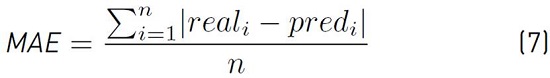Metrics. Three standard metrics were used for evaluation: Mean absolute percentage error (MAPE, Equation (5)], root mean square error (RMSE, Equation (6)] and mean absolute error (MAE, Equation (7)]; reali represents the measured value for t = i, predi represents the predicted value and n represents the predicted horizon length.