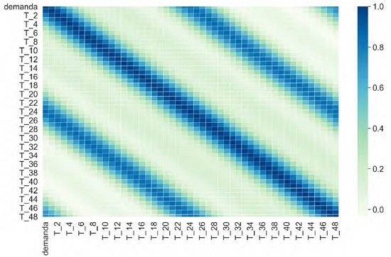 According to Figure 1, highly correlated demand values correspond to the immediately preceding hours and from the same hours of the day before.