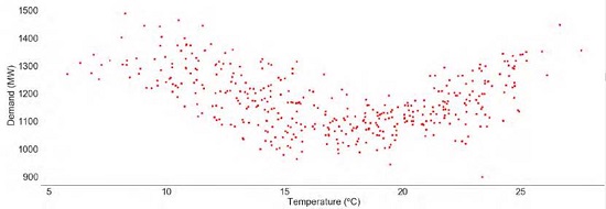 Several visualization analysis were performed to gain an intuitive insight of the information contained in each feature. The most relevant fact confirmed in this preliminary analysis was the daily periodicity of the demand value in all scenarios. The diagram shown in Figure 1 reports the high correlation between actual demand and the demand of the same hour of two days before in the case of the industrial park scenario. Weather data was not considered in the industrial scenario because of the very low correlation. However, in both scenarios that contain residential consumption data, weather variables are highly correlated with demand. Figure 2 presents the relation between temperature and total consumption for the scenario of total demand of Uruguay showing that demand values are higher in extreme temperatures. Data preprocessing was performed using pandas library[32]. A linear regression model Msim was trained using the sklearn toolkit[33], configured with default parameters as benchmark model. New training and test datasets were produced keeping only the relevant features, according to the analysis performed to determine the relative importance of each feature.