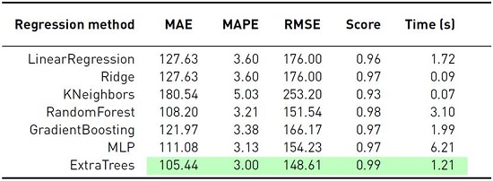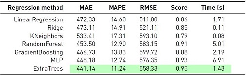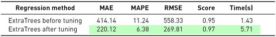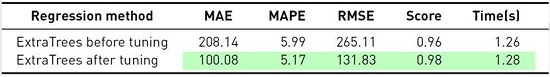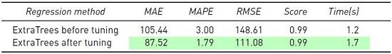 Results computed by the tuned configuration of ExtraTreesRegressor considerably improved the baseline (non-tuned) version, regarding the three studied metrics. In particular, MAPE reduced from 3.00% to 1.79%.