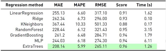 Results reported in Table 1 for the industrial scenario indicate that three of the studied methods achieved the best results regarding the analyzed metrics. Focusing on MAPE, Extratreesregressor improved over MLP by 4.16% and over RandomForest by 6.54%.
