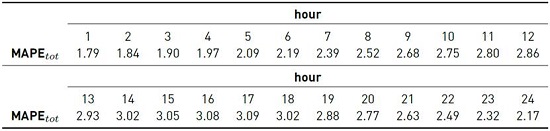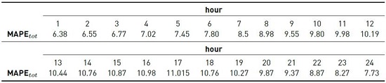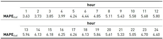 Analyzing the obtained results for the MAPEtot metric for each one of the 24 hourly models, the performance got worse from i = 1 to 17 and then improved from i = 18 to 24. These results show that highly correlated demand values performed better, as expected.