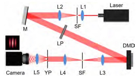 The experimental setup is shown in Figure 1. A He-Ne laser (THORLABS HNL100L) with a wavelength of 632.8 nm is expanded and spatially filtered by the lenses L1, L2 and the spatial filter SF. The mirror M redirects the beam toward the DMD in such a way that the micromirrors in the ON state reflect the light directly to the camera, in a 4f optical system. Lens L3 forms an optical Fourier transform of the transmittance displayed on the DMD plane, and the spatial filter SF only allows passing the first order of diffraction towards the apertures. L3 and L4 are in confocal configuration to produce optically conjugated planes between the DMD transmittance plane and a screen containing a pair of Young’s apertures YP. Hence, the optical field described in Equation (3), and coded by Equation (4) to Equation (6) on the DMD transmittance, is optically transferred to the apertures. L5 is placed confocal to the camera and the apertures, to produce the far field interference pattern on the camera plane. Finally, a linear polarizer LP is used to control the light intensity.