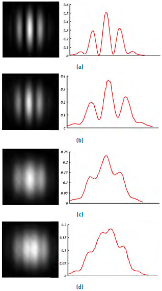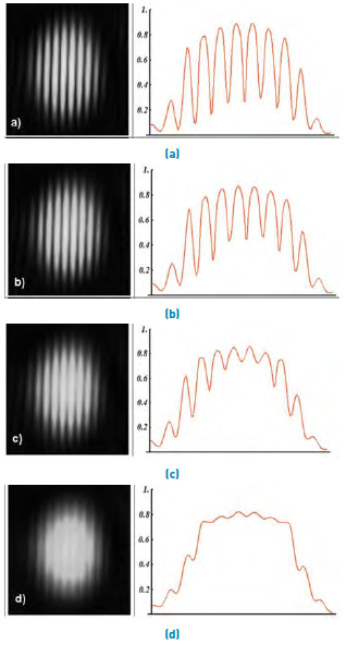 Figure 2 shows the evolution of the interferograms and a correspondent intensity profile when pairs of plane waves are rapidly alternated as their mutual tilt difference is increasing. One plane wave is taken as reference, making the first interferogram with maximum visibility, and then, is progressively combined with another plane wave a little more tilted (Examples in Figure 2a to Figure 2d). Figure 2d shows the result when the tilt is increased until