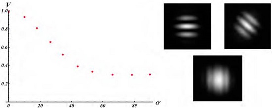 Additionally, the third experiment consists in rotating the pair of apertures to show how the spatial coherence has different values in each direction, by switching a pair of linear phases. Figure 6 shows the visibility and interferograms for a pair of apertures with a fixed separation and different rotation angles.