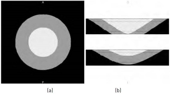 The dataset is constructed in order to simulate the endocardium and the left ventricle wall by means an internal cone and an external cone, respectively. In three-dimensional space, the computer generated cardiac phantom is shown as two truncated cones, inner and outer. The synthetic image size is 256 × 256 × 50, and it is quantized signed to 12-bit. The dimensión of the axial plane is set to 256 × 256 because in this two-dimensional region the left ventricle in a normal CT cardiac scan is located. Moreover, 50 CT slices are considered because that amount represents 20% of a cardiac scan, which is the region size normally scanned for the left ventricle. Figure 1 shows the synthetic image. The axial view at slice 25 is shown in Figure 1.a meanwhile Figure 1.b shows the coronals views at planes 141 and 182 respectively. The image is corrupted with noise using the algorithm proposed in[25].