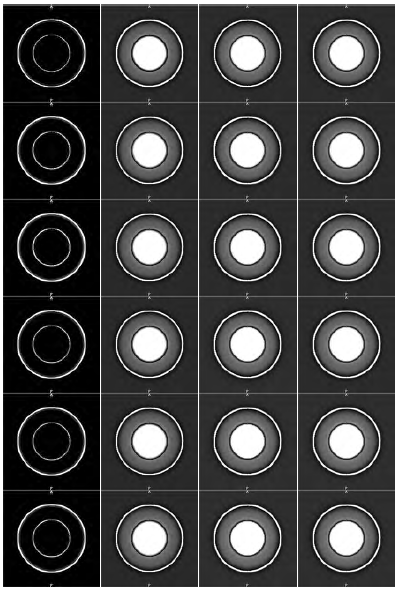Figure 2 shows the twenty-four images generated from the each combination of cases-neighborhood space. Figure 2 can be explored as a matrix with the following characteristics, each column represents each case main, residual1, residual2 or full, while each row represents a neighborhood space. The first row represents the neighborhood space for n = 1, the other rows for n = 2, 3, 4, 5, 6. Through the visual inspection of images in Figure 2, it has been demonstrated the effectiveness of the similarity enhancement filter in improving the quality of images corrupted with noise and artifacts.