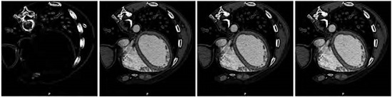 We consider two clinical dataset. A first dataset used in this study was obtained as sequences 4-D (3-D + time) of cardiac images acquired with a scanner (LightSpeed VCT General Electric Medical System). Each database consists of 20 volumes representing anatomical information for a complete cardiac cycle for a patient. The spatial resolution of each volume is (512 × 512 × 326) voxels. In all volumes, the slices have isotropic resolution voxels with a pixels size of 0.488 mm and the slice thickness is the 0.625 mm. Each volume voxel is quantized to 12 bits.