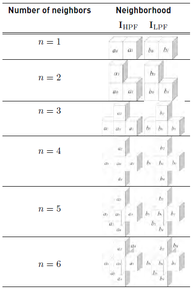 Table 2 shows the six possible configurations that the cross-shaped neighborhood can take, if n varies between 1 and 6. For n = 6, in Table 2, the figures correspond with a full cross shaped neighborhood. For this configuration, in the IHPF image, a0 represents the gray level information of the voxel at position (i, j, k) whereas a1, a2, a3, a4, a5 and a6 represent the gray level values of the voxels (i, j + 1, k), (i, j, k + 1), (i, j − 1, k), (i, j, k − 1), (i + 1, j, k), (i − 1, j, k), respectively. Likewise, voxels in the ILPF image are denoted with b and their respective sub-indexes represent the same position in the neighborhood. The neighborhood space required for analyzing our similarity enhancement filter is then constructed with the configurations shown in Table 2.