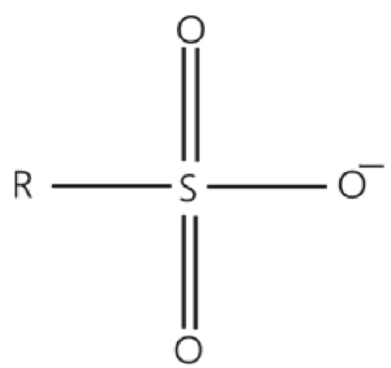 Organic chemistry define sulfonate as an anionic ion that contains the functional group SO3-[19]. Figure 1 shows the molecular structure of a typical sulfonate group, where R corresponds to the respective organic group that is joined to the ion.